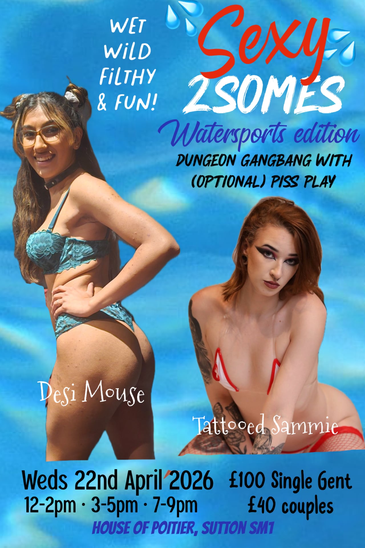 Choose from 12-2pm, 3-5pm or 7-9pm, meet Desi Mouse & Tattooed Sammie for some wet and wild fun in the private dungeon. Watersports (giving & receiving) is totally optional & […]