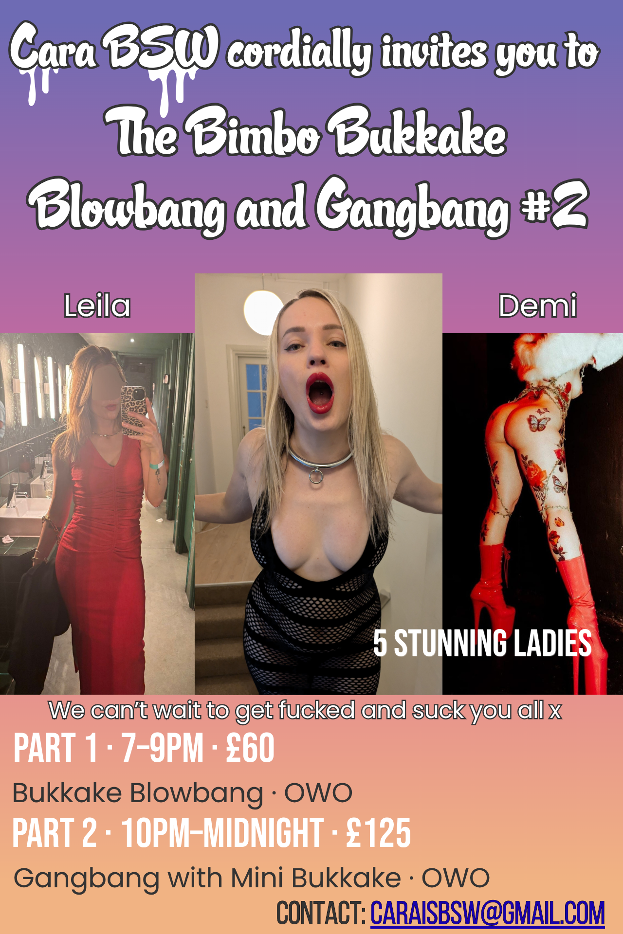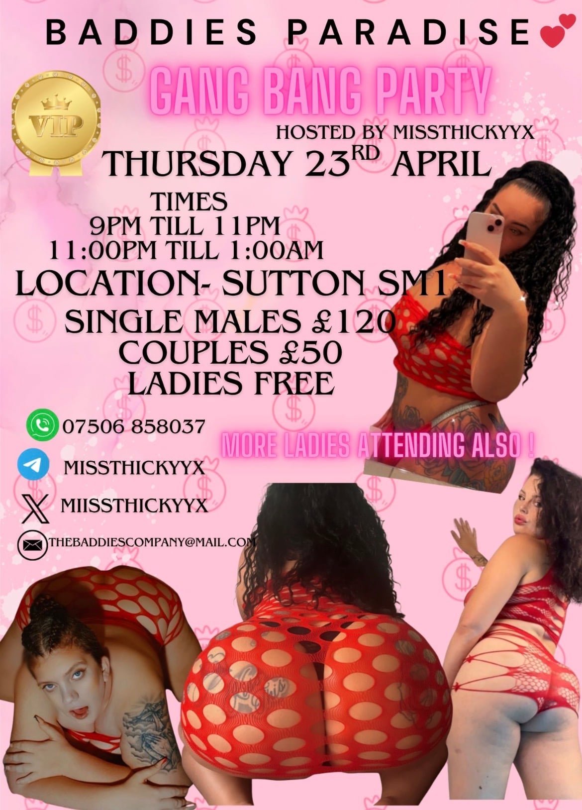 9pm - 11pm and 11pm - 1am Contact for tickets Telegram - missthickyyx WhatsApp - 07506 858037 Email - thebaddiescompany@mail.com