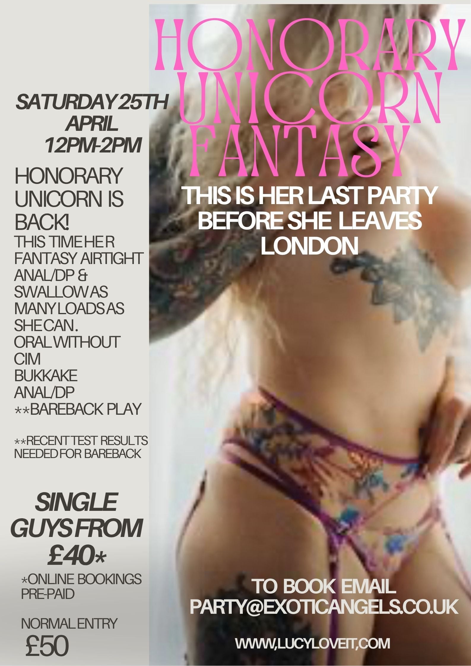 Booking essential - email party@exoticangels.co.uk www.lucyloveit.com